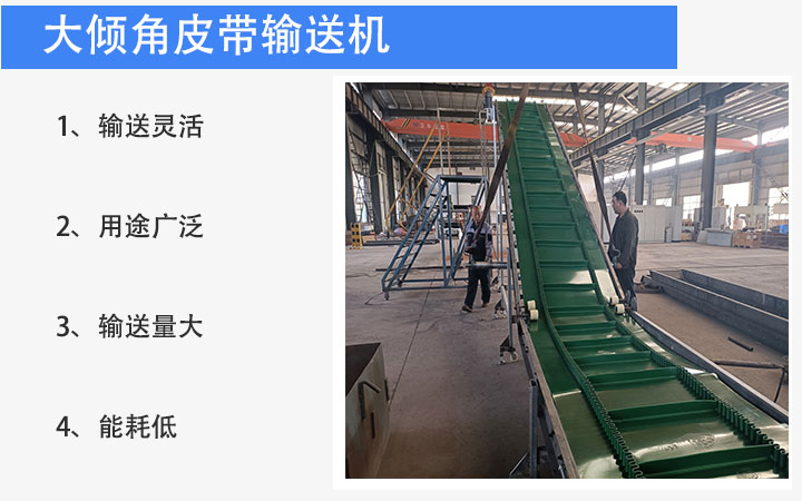 大傾角皮帶輸送機是利用輸送帶上面的裙邊擋邊擋板形式,加上改向滾筒,可做成50-90度的角度,具有容量大,通用性強的特點。